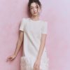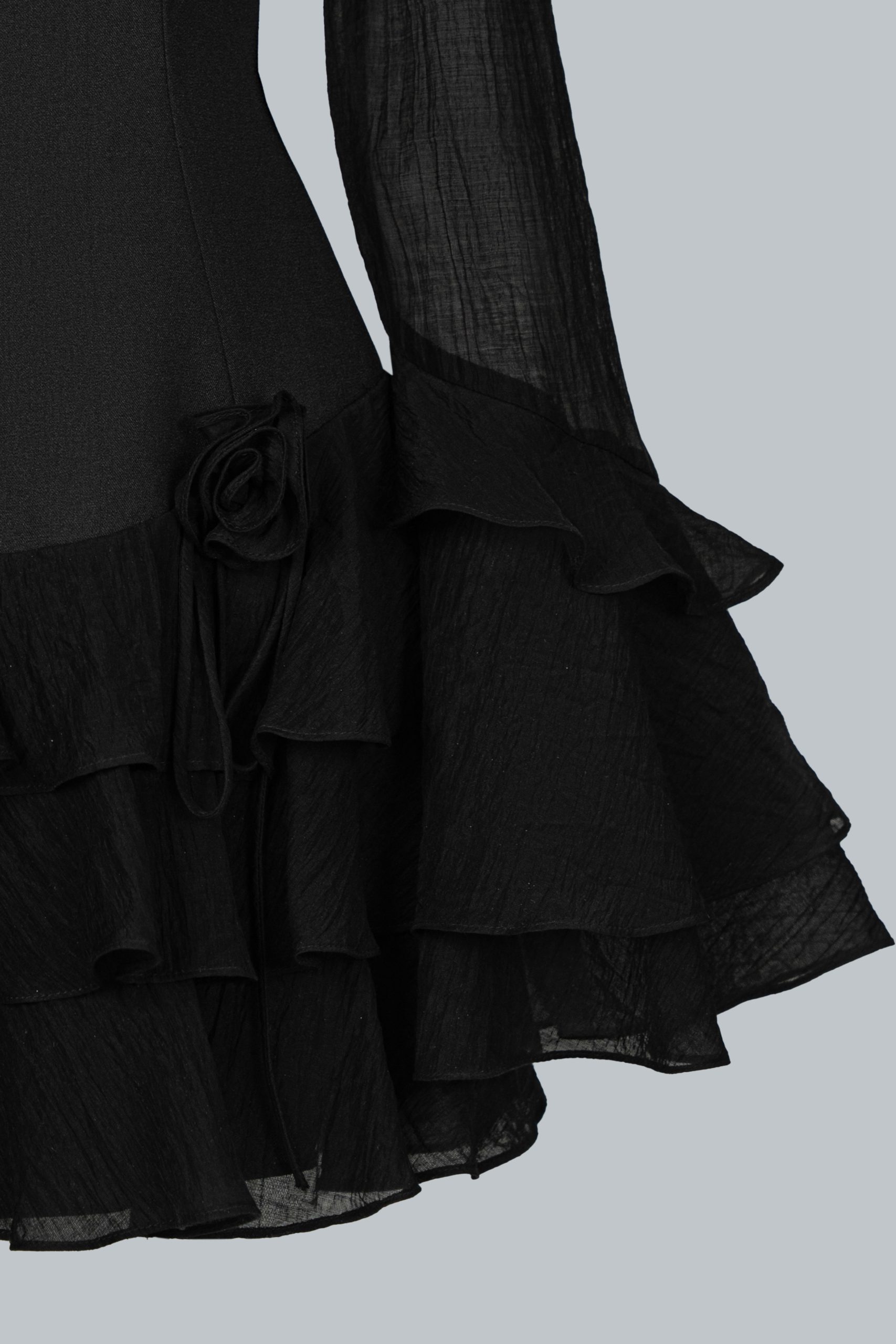 Dáng đầm trễ vai phối corset nhẹ, phần eo ôm gọn tôn dáng, tùng váy bung nhẹ về phía chân tạo silhouette mềm mại. Phần ngực và tay được xử lý bằng các lớp bèo tơ xếp tầng – chạy ngang và loe rộng như cánh hoa đêm, vừa tăng hiệu ứng bồng bềnh, vừa giúp tổng thể trở nên sinh động. Tay áo dài xuyên thấu, nhẹ như khói, cân bằng giữa sự nữ tính và tinh thần hiện đại. Chi tiết hoa đính có thể tháo rời, linh hoạt cài ở ngực váy hoặc thân váy tuỳ theo phong cách.