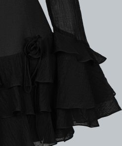 Phối hợp giữa tơ mỏng và poly weft stripe: phần thân ôm bằng vải dày dặn giúp giữ phom, còn phần tay và bèo sử dụng lớp tơ nhẹ – tạo chuyển động bay bổng. Tông đen quyến rũ và tông kem thanh thoát đều mang đến hai sắc thái khác nhau cho cùng một phom dáng.