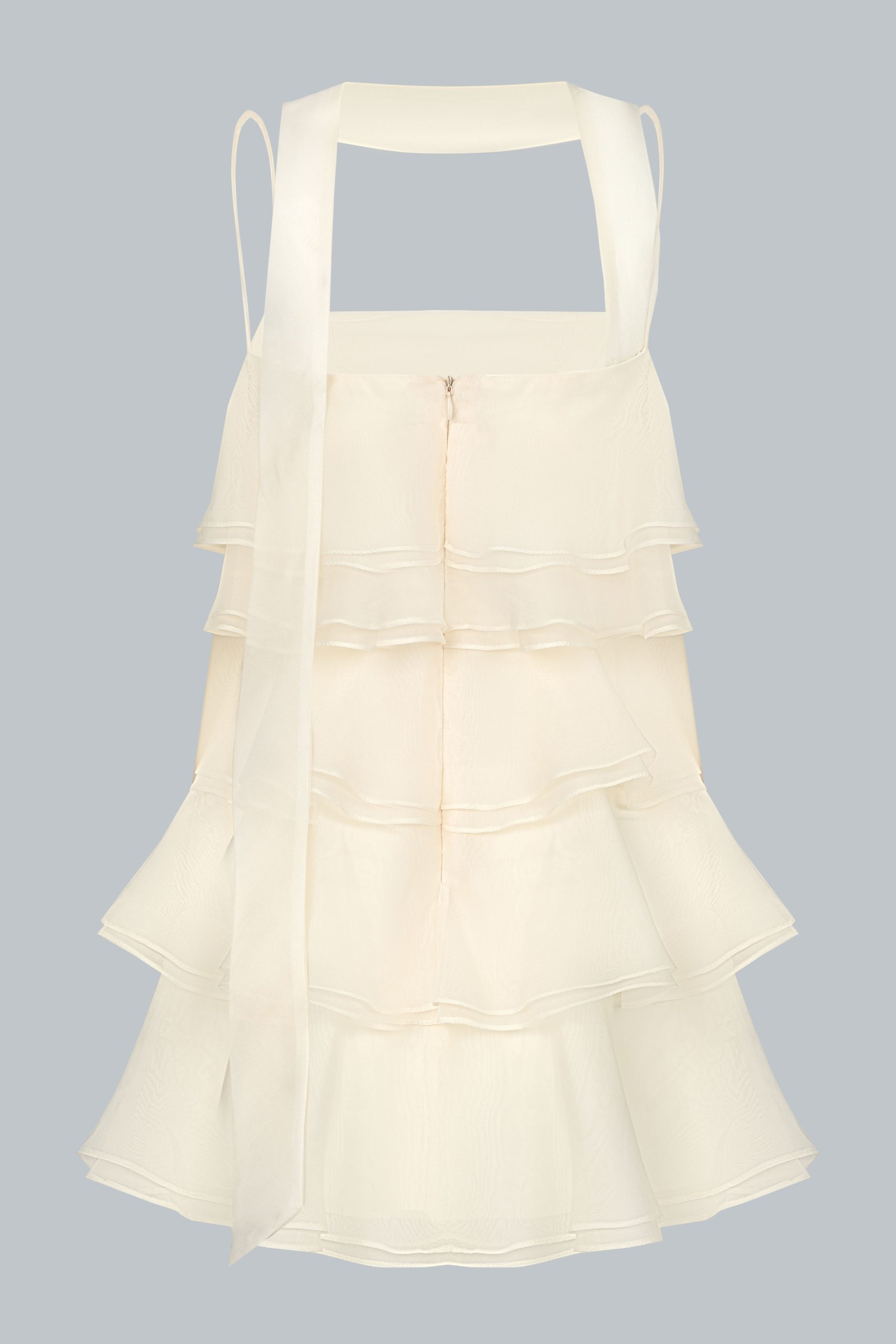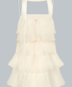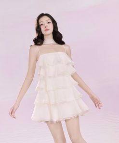 Dáng đầm mini suông nhẹ, được tạo hình bởi 10 tầng bèo xếp ngang chạy dọc thân váy. Mỗi lớp bèo được xếp mềm mại, tạo độ bồng vừa phải và chuyển động mượt mà theo từng bước chân. Cổ vuông thanh thoát, kết hợp dây vai spaghetti mảnh – khoe trọn phần vai và xương quai xanh. Thiết kế không kén dáng, dễ mặc, dễ tôn chiều cao và tạo hiệu ứng “fairy-like” đầy cuốn hút.